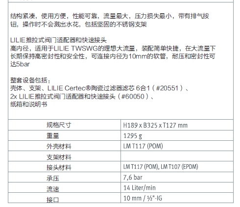内容:外壳、6 合 1 滤芯、支架、2 个 LILIE 按压连接阀适配器和快插接头、包装盒和说明书